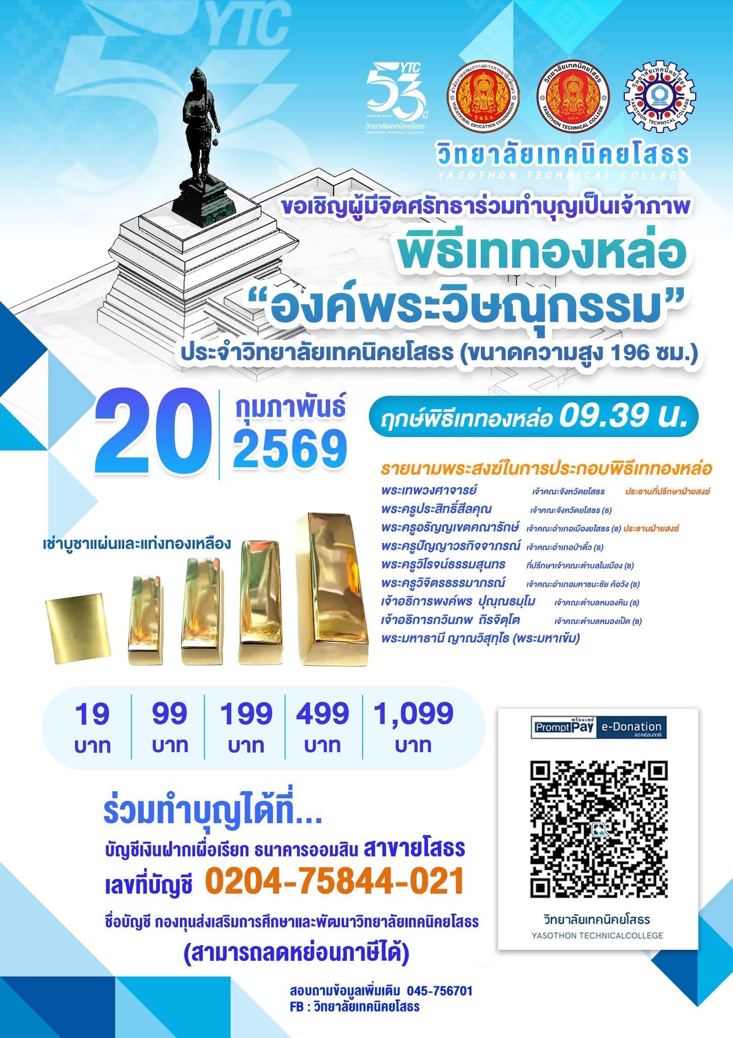 | 33905 | 104 | 2026-01-27 | หนังสือราชการภายนอก ขอเรียนเชิญร่วมพิธีและเป็นเจ้าภาพพิธีเททองหล่อ องค์พระวิษณุกรรม วท.ยโสธร | วิทยาลัยเทคนิคยโสธร | - |