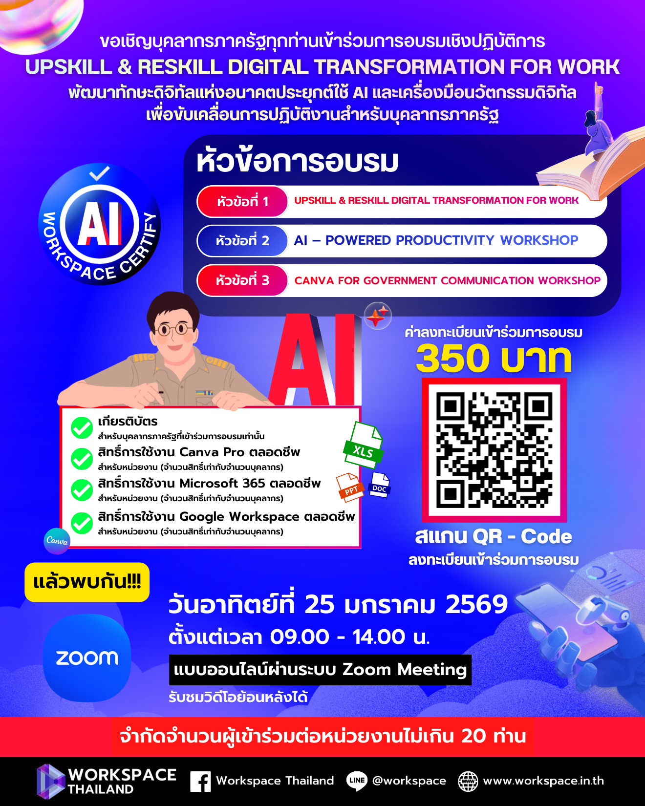 | 33748 | ว 2 | 2026-01-13 | หนังสือราชการภายนอก ขอเชิญเข้าร่วมการอบรมเชิงปฏิบัติการ UPSKILL & RESKILL DIGITAL TRANSFORMATION FOR WORK พัฒนาทักษะดิจิทัลแห่งอนาคตประยุกต์ใช้ AI และเครื่องมือนวัตกรรมดิจิทัลเ | บริษัท เวิร์คสเปซ ไทยแลนด์ | รองฯ 4 ฝ่าย , ครูทุกท่าน , รองฯ สมพงษ์ |