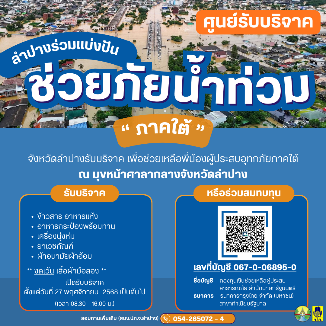 | 33311 | ว 25041 | 2025-11-28 | หนังสือราชการภายนอก การรับบริจาคเงิน สิ่งของอุปโภคบริโภค ยา เวชภัณฑ์ และเครื่องใช้ส่วนตัว เพื่อช่วยเหลือผู้ประสบอุทกภัย ในพื้นที่ภาคใต้ | จังหวัดลำปาง | รองฯ 4 ฝ่าย , บุคลากรทุกท่าน |